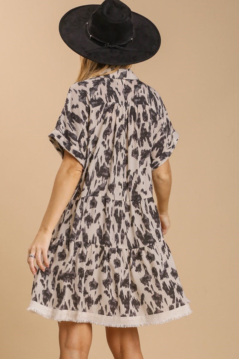 Trendy animal print dress by Umgee featuring a tiered design, short sleeves, collared neckline, and frayed hem.? Great to layer with a jacket!? Belt not included.? We love the animal print and flattering tiered style.? This dress is perfect for fall and will make a great go-to piece in your closet!