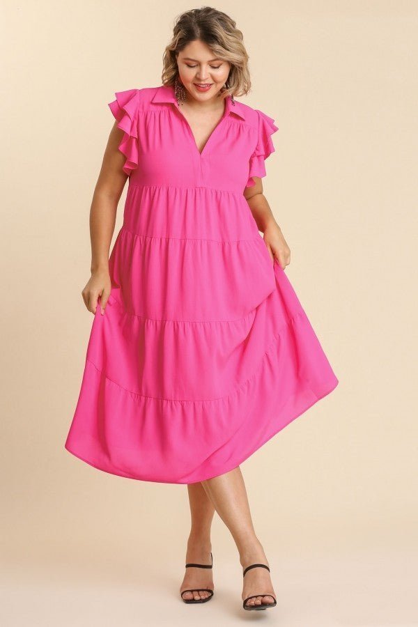 This Umgee dress features a tiered design, midi length, ruffled short sleeves, and a collared split neckline.